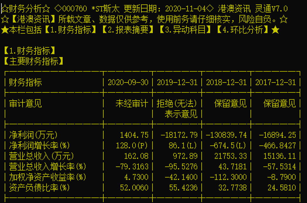 *ST斯太2019年财务报告被亚太所出具无法表示意见的审计报告,无法表示意见涉及持续经营能力存在重大不确定性、无法确定前期问题对财务报表的影响、长期股权投资的核算期末计价、闲置土地被强制收回、信托投资可回收金额的确定等多个主要会计科目和重要事项,涉及事项较为复杂,相关事项至今尚未消除。