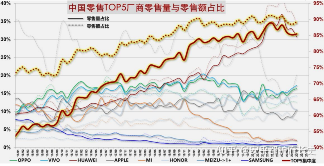 「华为芯片断供」是中国乃至全球手机发展史的重要节点,顶峰时期,华为+荣耀拿下了国内市场份额半壁江山,2020 第一季度,华为甚至超越霸榜多年的三星,问鼎全球手机第一。