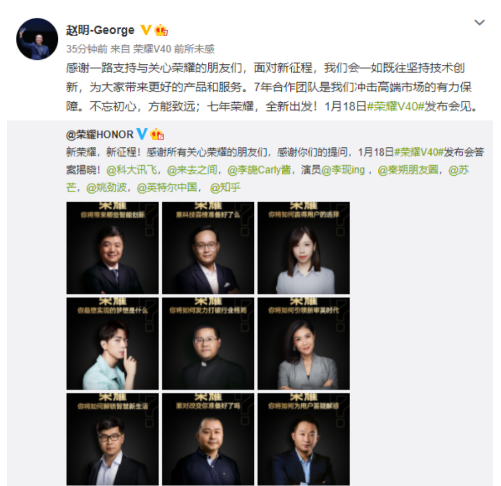 考虑到原有渠道商与荣耀的关系,加之现有股东包含着 30 多家渠道商与供应链,这层关系要远胜于品牌与渠道的合作属性。这其中,不少代理商、经销商已坚持十几年、二十几年的渠道深耕,其线下力度可想而知。1 月 11 日全行业领袖人物、顶流媒体及渠道伙伴等以#荣耀 V40#为话题,为荣耀送上祝福的事件引发互联网震动。不只是知乎创始人周源、中国时尚女性意见领袖苏芒、新浪微博 CEO 王高飞、英特尔市场营销集团副总裁王稚聪等 9 位行业大咖,其中更有来自代理商、经销商等荣耀全渠道体系合作伙伴的助阵显示出其紧密的关系。