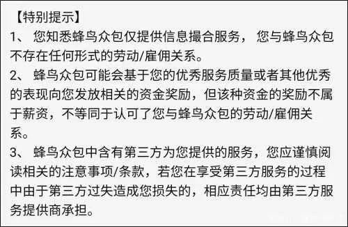 简单来说,结论一致:不管骑手的身份是什么,与外卖平台都没有劳动关系。平台会在协议中“特别提示”:平台提供的是信息撮合服务,与骑手不存在任何形式的劳动/雇佣关系,骑手所得收入是资金奖励,不属于“工资”。
