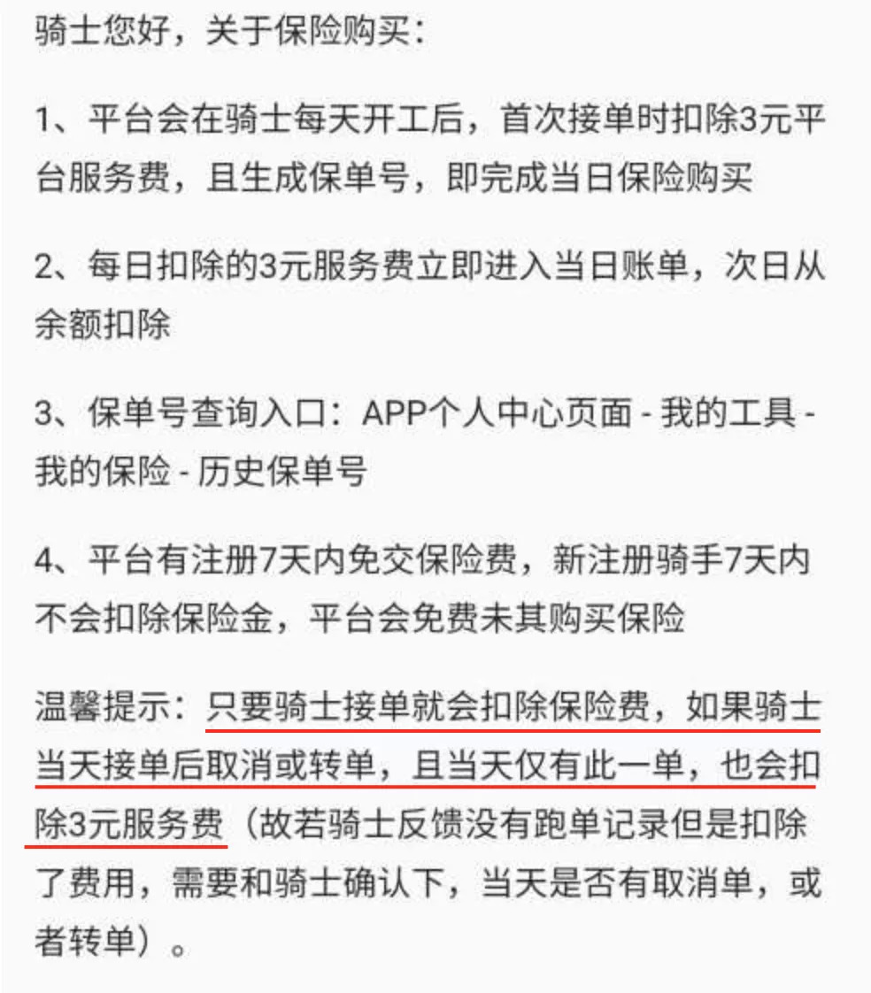 从网友提供的关于这笔保险说明的截图来看,图中这段表述很容易理解为,骑手被扣除的3元都被用于购买人身意外险了,但事实上,平台收取了其中的65%作为服务费,只有1.06元花在了保险上。换言之,一年365天的保费是386.9元,但骑手个人需要被扣1095元。