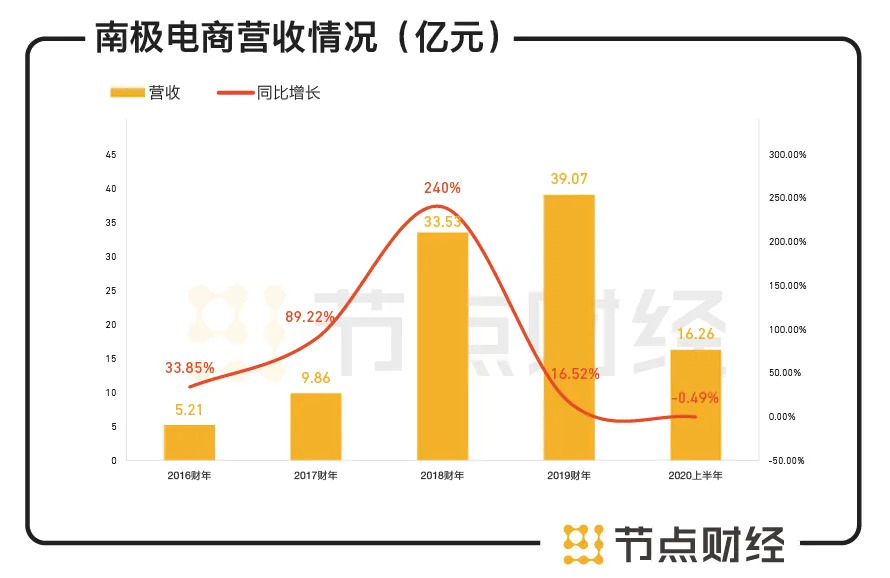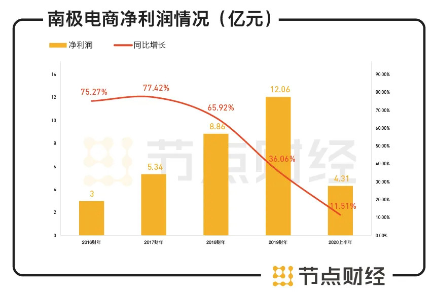 借壳上市后,2016年到2019年,南极电商的营收从5.32亿元增长到39亿元,翻了近8倍;净利润从3亿元增长到12亿元,翻了4倍。财报显示,2020年前三季度,南极电商实现营收27.7亿元,同比增长4.7%;净利润为7.2亿元,同比增长19.9%。