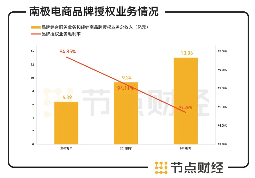 在营收和净利润快速增长的同时,南极电商的品牌综合服务业务和经销商品牌授权业务收入也在逐年增加。财报显示,2015年至2019年,南极电商的上述两项品类的收入总和分别为2.74亿元、4.66亿元、6.39亿元、9.34亿元和13.06亿元。2019年,其品牌授权业务的净利润超过10亿元。