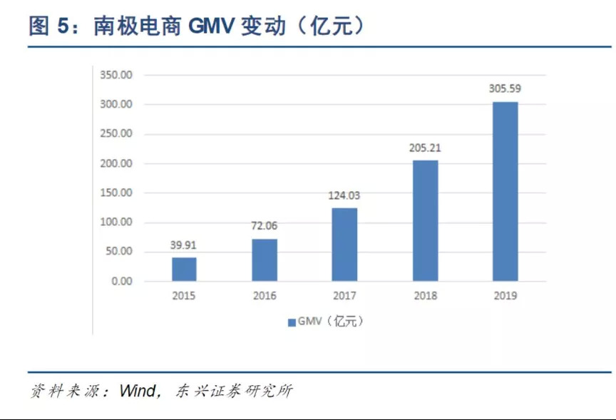 以GMV来说,2016年以来,南极电商的GMV增长可以说是突飞猛进。贴牌模式下,南极电商的GMV主要包括其经销商在电商平台销售该品牌产品的成交总额。