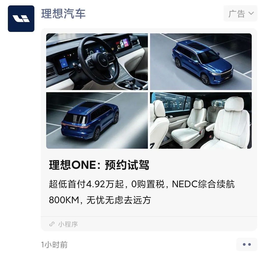 从广告投放逻辑来看,理想汽车的广告主要集中在线下户外广告、线上开屏广告、朋友圈广告等,和其他造车新势力相比,广告投放逻辑相对单一。