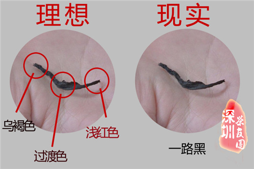 好的大红袍,一节干茶应该分成三种颜色:头部乌褐色、中间过渡色、尾部浅红色。反面例子,就是小编的这款渣渣茶:从头到尾一路黑……