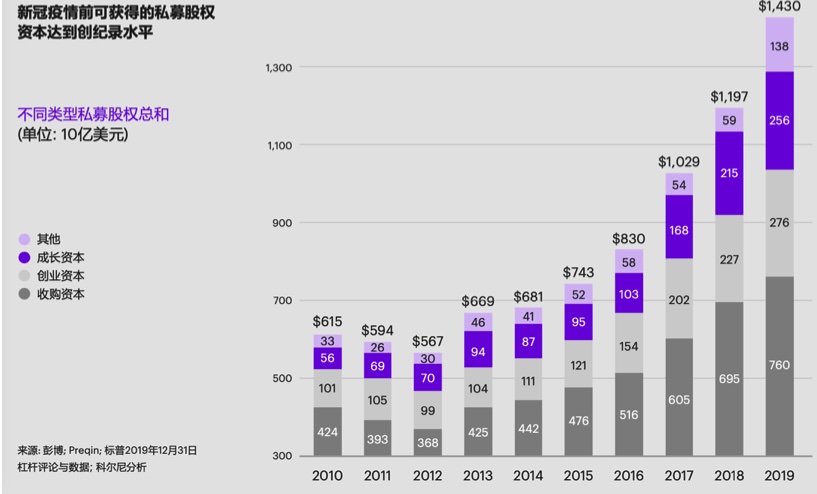 疫情带来的经济混乱削弱了全球企业的财务状况。与此同时,在疫情的影响下,市场上待投资本已经达到1.5万亿美元,并且出现了大量财政疲软的被收购目标。这一趋势将带来行业颠覆和整合浪潮,实力强的公司收购实力弱的竞争对手、技术或资产。因此未来五年,私募股权、大型科技公司和能源行业将面临大规模重组。