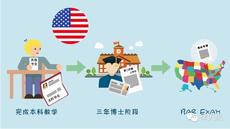 一般来说,美国大学在本科阶段不开设法学专业,因此所有立志成为律师的美国学生,必须先完成本科教学,然后申请各法学院的Juris Doctor (J.D.)学位,完成3年(大部分法学院的要求是一学期修满12个学分)的博士阶段学习(各州可能对学分等要求各异),然后提交申请材料,参加各州的Bar Exam。