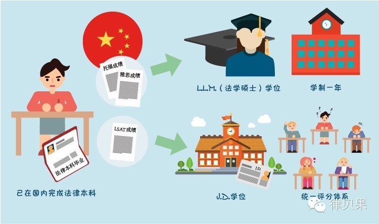 由于已经在国内完成了法律本科,因此在申请学校时,大多申请的是L.L.M.(法学硕士)学位,这个学位一般的学制是一年,只需用托福或雅思成绩申请,申请的准备比较简单,成功率较大(有一些学校的L.L.M.课程,专为国际学生开设);J.D.学位的申请,还需要提供LSAT成绩,对申请者的要求较高,学习压力较大(与美国学生一同上课,并采用统一评分体系进行考核)。
