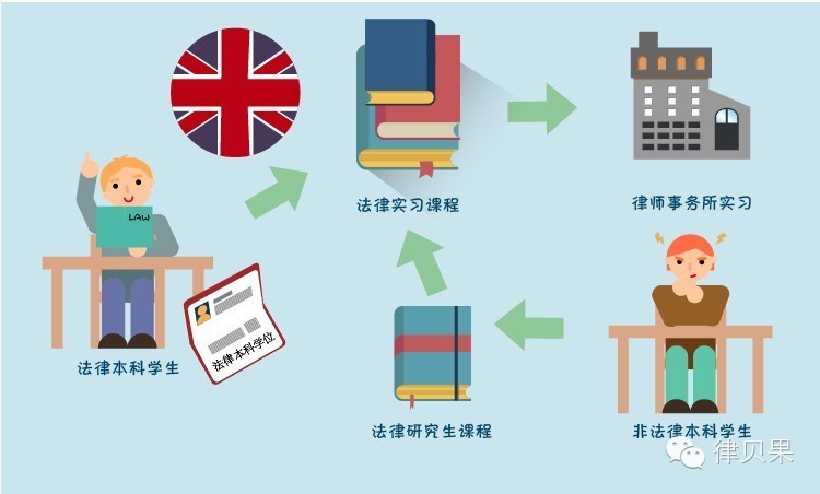 和美国不同,英国的本科阶段开设法律专业,学生在本科阶段就可学习法律,对于获得英国法律本科学位的学生,毕业之后须修读法律实习课程,才可申请律师事务所实习;非法律本科的学生,在修读法律实习课程之前,须完成一年的法律研究生课程PgDL (Post graduate Diploma in Law)。