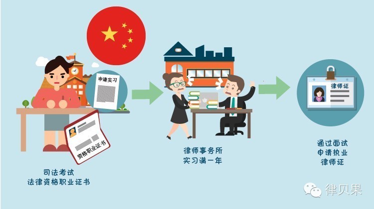完成法学院学习,参加并通过司法考试,拿到法律资格职业证书,向律协申请实习,在符合条件的律师事务所实习满一年后,申请并通过面试,申请执业,拿到律师证。其中,实习期间必须参加各地律协组织的培训等,以上海为例,通过集中培训的考试,完成每周实习周记的网上填写、修满在线课程学分,以及其他要求的内容,到实习期满后,方可申请面试。没有拿到律师证的实习律师,统称为“律师助理”,实习律师不可独立执业。