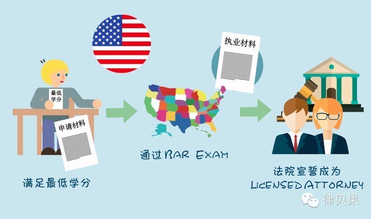 各州对外国学生有最低学分要求,满足最低学分,递交申请材料,才可参加Bar Exam(各州的立法对参加Bar Exam考生的资质要求各异,考试内容也各异,目前中国学生参加较多的是纽约州和加州的考试),通过Bar Exam后递交申请执业材料,等待安排法院宣誓,完成宣誓成为一名Licensed Attorney,如需在法院开展业务,向各州立法院或联邦法院递交申请,成为该法院的认证律师。