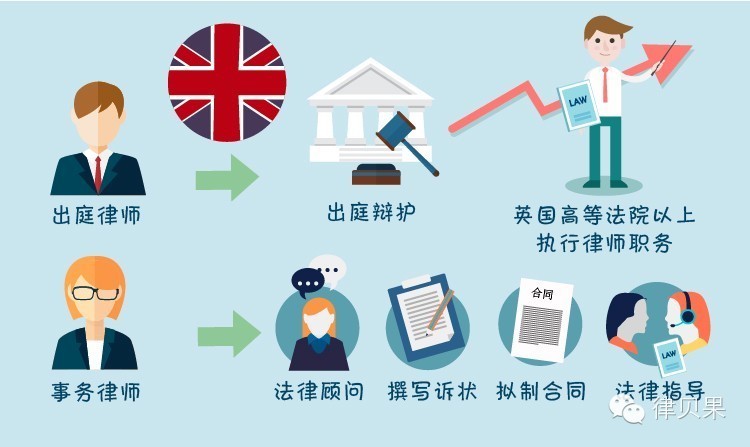 和美国不同,英国沿用了历史上形成的所谓“二元主义律师制度”,把律师分为出庭律师和事务律师两大类,彼此分立,两者的培训模式、执业路径不同。其中,出庭律师,其业务是出庭辩护,出庭律师能在英国高等法院以上执行律师职务。事务律师,其业务更多的是从事非诉讼类、事务性的工作,如担任法律顾问,撰写诉状、拟制合同,对当事人进行法律指导,在高等法院及下级法院进行辩护等。事务律师和出庭律师是两种不同类型的律师,二者没有隶属关系,申请执业的要求各异,事务律师也不能晋升为出庭律师。