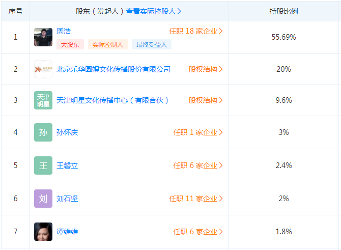 根据天眼查显示,该公司主要经营范围为经营演出及经纪业务等。公司实际控制人和最终受益人为周浩,持股55.96%,为第一大股东。