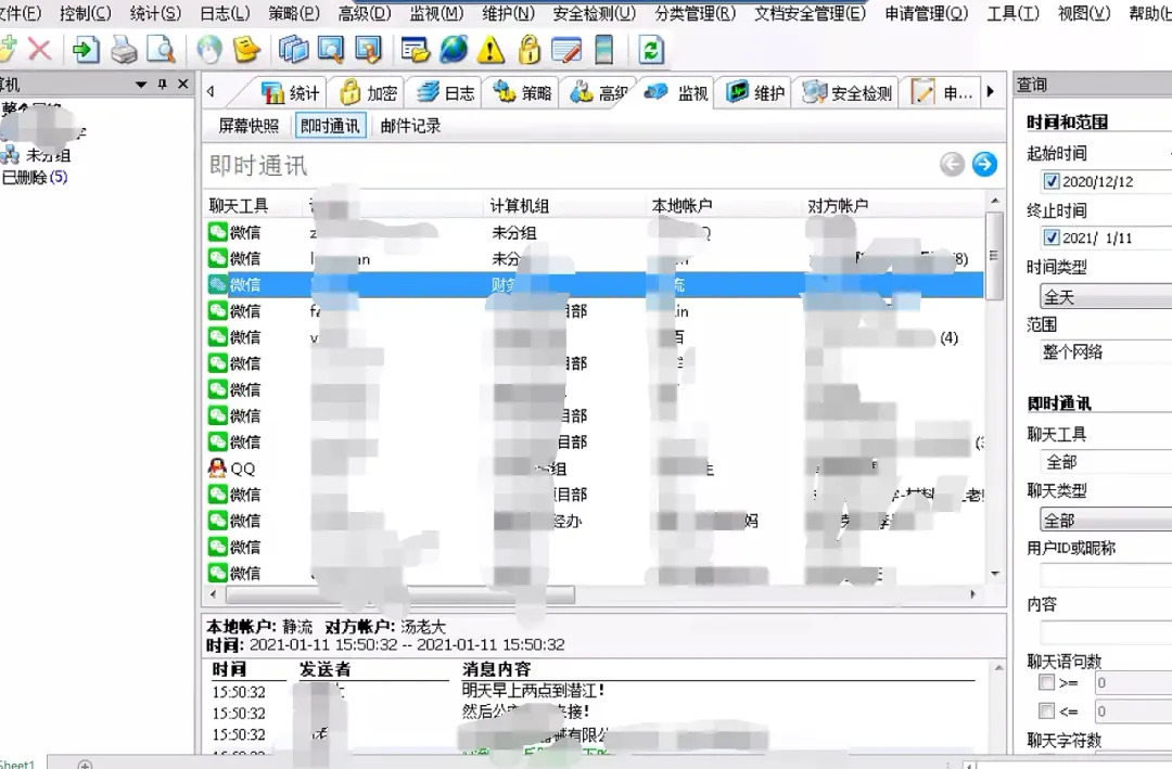 不光如此,老沉还坦言,各种聊天(包含收费加密版本)、收发邮件、上传文件、上网浏览记录、发帖回帖等所有操作都可以被记录下来。为了证明这不是危言耸听,老沉向《IT时报》记者提供了一张监控软件的后台截图,从这张截图上,记者能看到微信、QQ这些常见的即时通信工具的实时监控内容,包括对话双方的账号以及对话的内容。