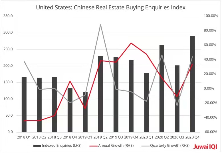从询盘量来看,根据居外IQI研究,国人在美国咨询房产的指标自2019年第四季度开始波动明显,连续四季度年增长率持续走低。