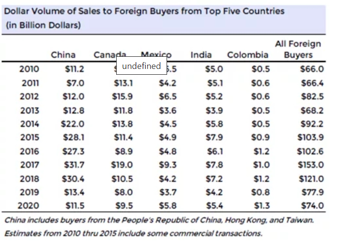 而NAR发布的《2020年美国住宅房地产国际买家报告》显示,中国投资者虽仍以115亿美元的总额登顶美国住宅的前5大国际买家,但中国也是其中唯一一个购买总金额下降的国家。