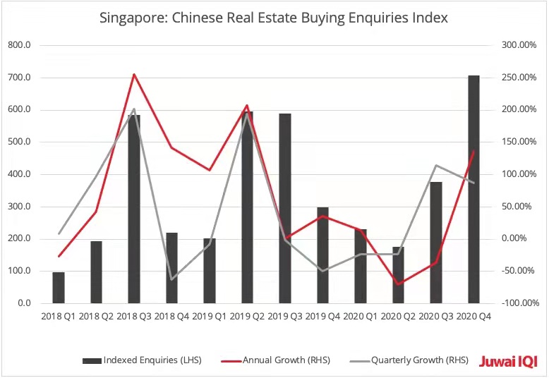 居外IQI Kashif指出,去年11月中国买家对新加坡房产的询盘量环比增长384%,同比涨250%。与一年前相比,中国买家的咨询量上升2.5倍,达到有史以来的最高点。