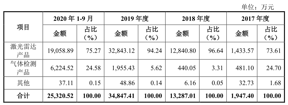 收入结构中,2020年前三季度,禾赛科技收入中有75.27%来自激光雷达产品,24.58%来自气体检测产品。气体检测产品是禾赛科技的起家业务,包括激光甲烷遥测仪和激光氧气传感器,可用于燃气公司检测气体泄漏等场景。2020年疫情爆发期间,呼吸机中使用的激光氧气传感器需求量增加,带动公司气体检测产品增长。但这部分增长预计后续难以维持。