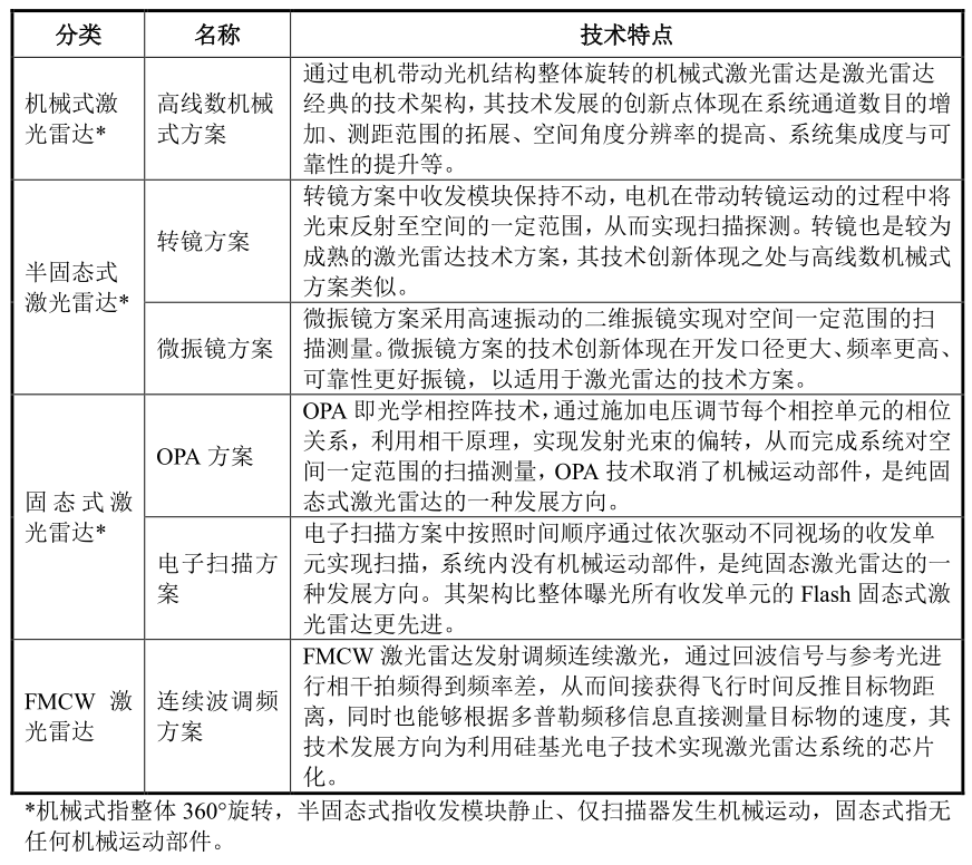 在技术路线方面,激光雷达行业并没有形成统一共识,呈现百花齐放的局面。