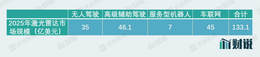 将此前沙利文对激光雷达市场的预测进一步拆细。预计到2025年,四大主要应用场景无人驾驶、高级辅助驾驶、服务型机器人、车联网的市场规模分别为35亿美元、46.1亿美元、7亿美元和45亿美元。其中,能够承担高价激光雷达的场景只有无人驾驶,仅约占市场总规模的26%,剩下的场景拓展更多依赖低价激光雷达。而要实现低价,则是技术和规模共振的结果。