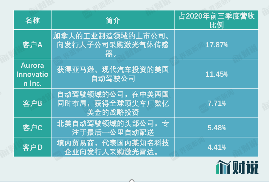 为如此高价激光雷达买单的,主要是新兴自动驾驶厂商。2020年前三季度,禾赛科技前五大客户中有四家是自动驾驶厂商,如公司第二大客户Aurora Innovation Inc. ,该公司位于美国,先后获得亚马逊、现代汽车的投资,并且收购了Uber的自动驾驶部门。禾赛科技在招股书中明确提到的自动驾驶汽车厂商客户还包括图森未来和百度。