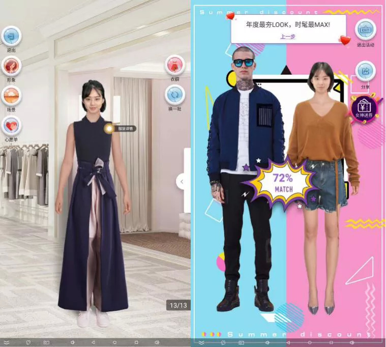另一家虚拟试衣品牌购搭则是以微信绑定的形式记录用户数据,顾客能上传照片客制化模特脸部,通过智能镜头扫描获取身材数据直接建立模型,通过优化 GPU 算法,使材质渲染更逼真,贴合度更高。还附有一键替换虚拟模特、T台动态展示、下载并分享自己穿衣视频或图片等趣味性功能帮助引流。