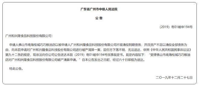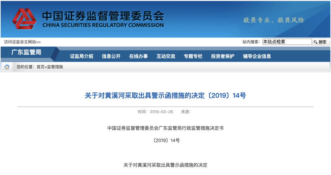 2019年2月,广东监管局正式决定,对黄溪河采取警示函的行政监管措施。同年12月,法院正式受理和兴隆的破产清算申请。