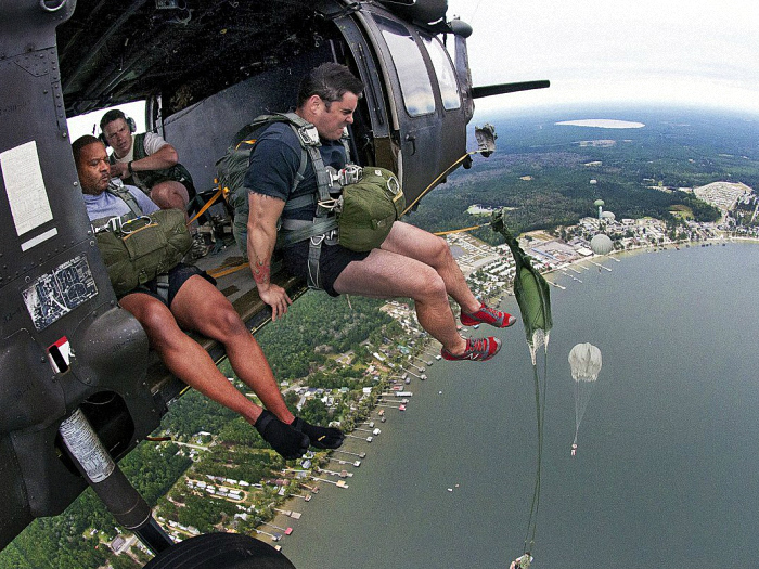 10. 2012年9月19日,北卡罗来纳州伊丽莎白镇附近的白湖上空,第95民事旅的一名伞兵从“黑鹰”直升机上跳伞。