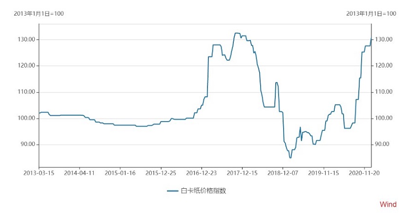 目前,白卡纸供需仍然偏紧。企业平均开工率持续维持在80%以上的高位。过去5年白卡纸行业需求复合增长率达到6%。2019年国内总需求达到802万吨,同比增长14%。白卡纸需求加速增长,但供给却十分有限。预计今年第四季度,金光纸业和太阳纸业白卡纸产能才会逐步落地。总体来看,行业供给端新增产能并不大。加之白卡纸行业第一和第二的金光纸业和博汇纸业已经合并,竞争大幅降低,有利于白卡纸价格中枢上移。因此,白卡纸涨价行情有望持续。截至1月15日,白卡纸指数站上130,已经接近2018年历史高点,白卡纸价格有望维持高位。