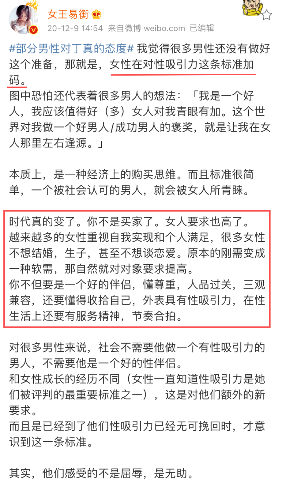 对于由丁真爆红而引发的部分男性的仇视,很多女性的反应其实最开始都和博主@女王易衡、@萝贝贝的声音一致:主流男性会非常惧怕女性从身体的层面去审视他们,而不是从主流社会所要求的权力、财富等一切让他们的资源和油腻并行不悖的条件。