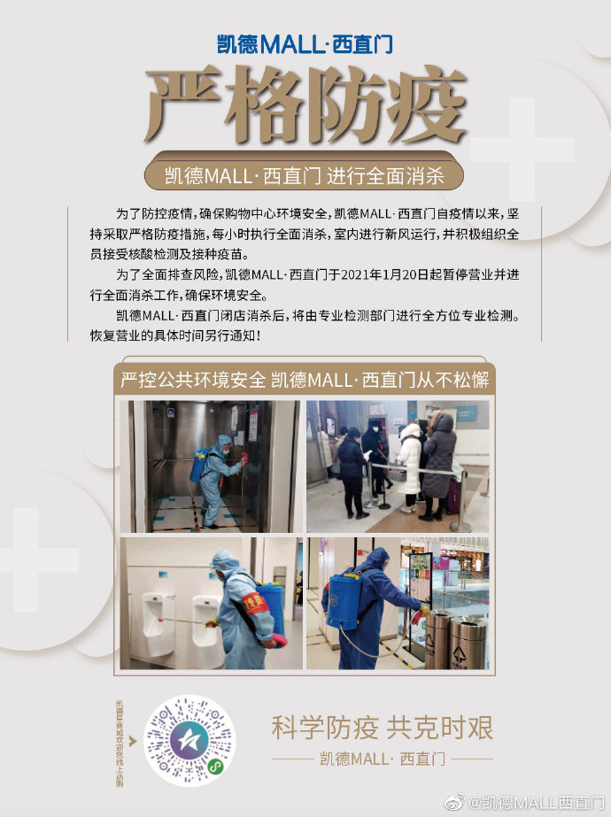 @凯德MALL西直门 微博1月20日表示,为了全面排查风险,今日起暂停营业并进行全面消杀。