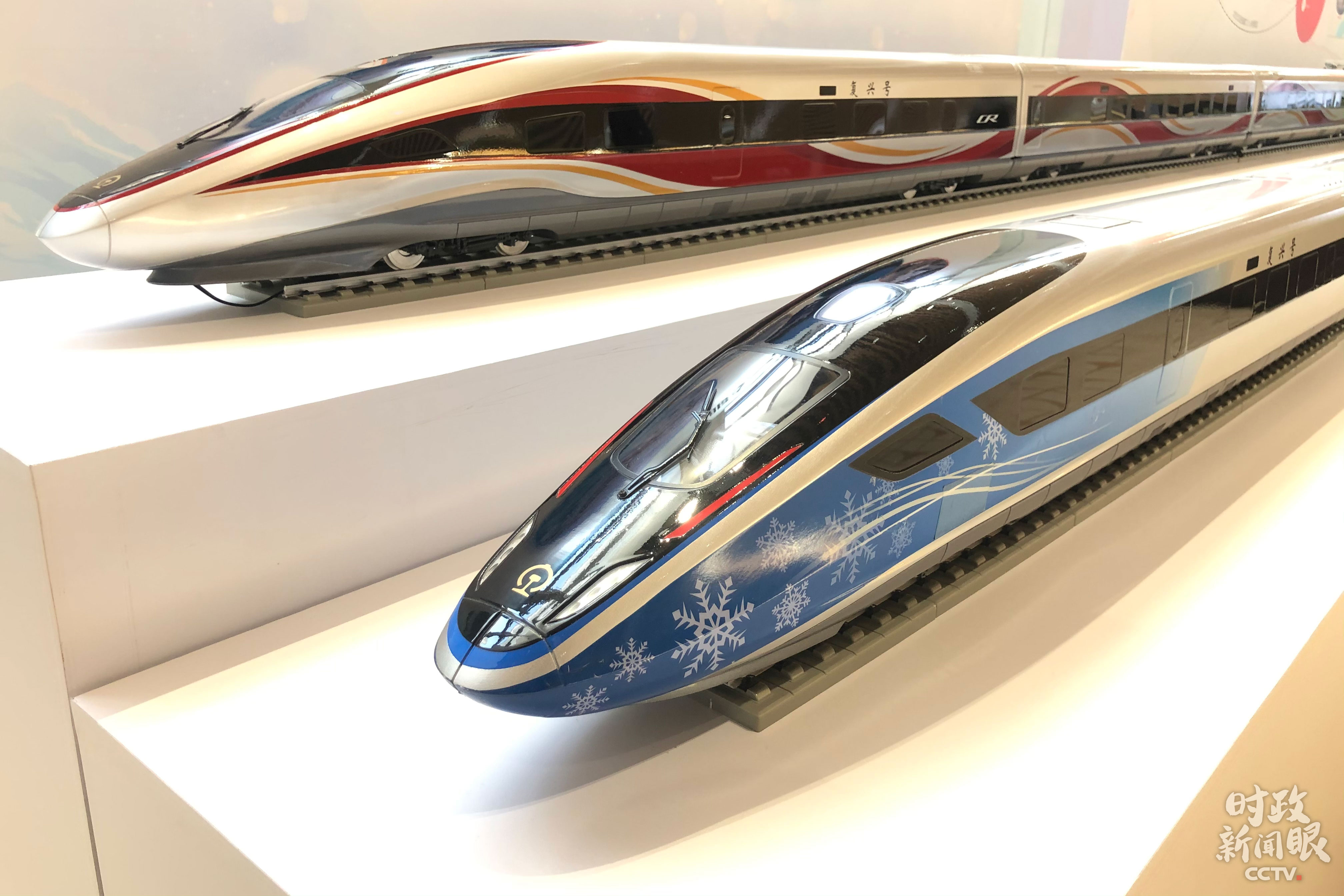 △京张高铁复兴号智能动车组“龙凤呈祥”和“瑞雪迎春”模型(总台央视记者许永松拍摄)