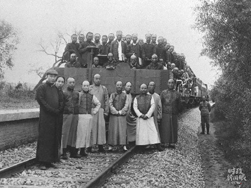 △这是京张铁路修成时,詹天佑(车前右三)和同事的合影。(资料图)