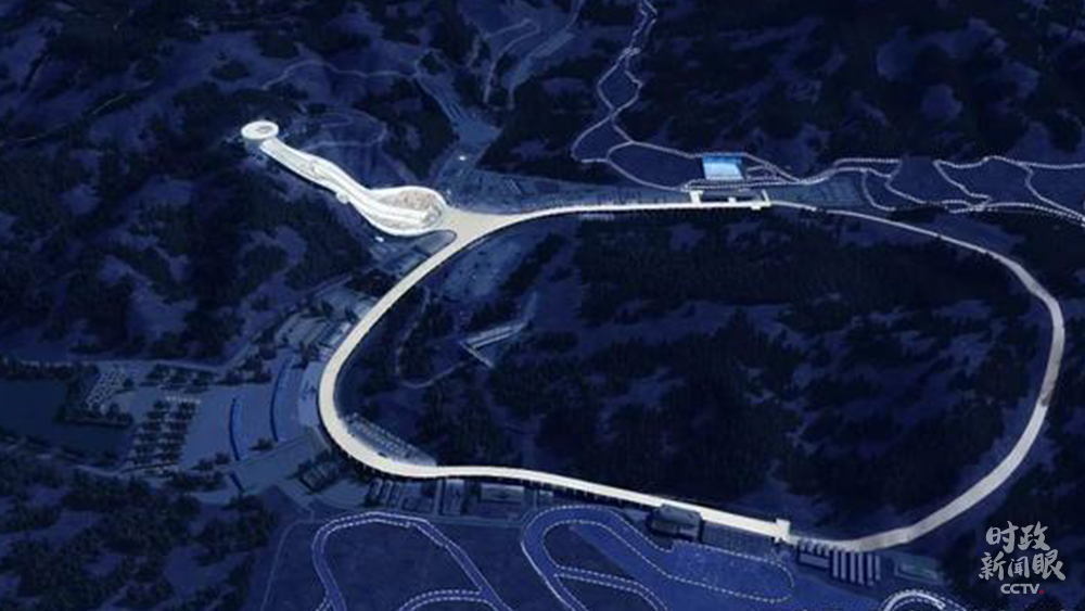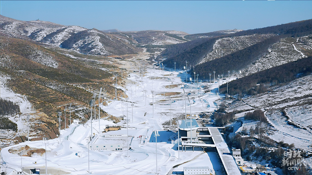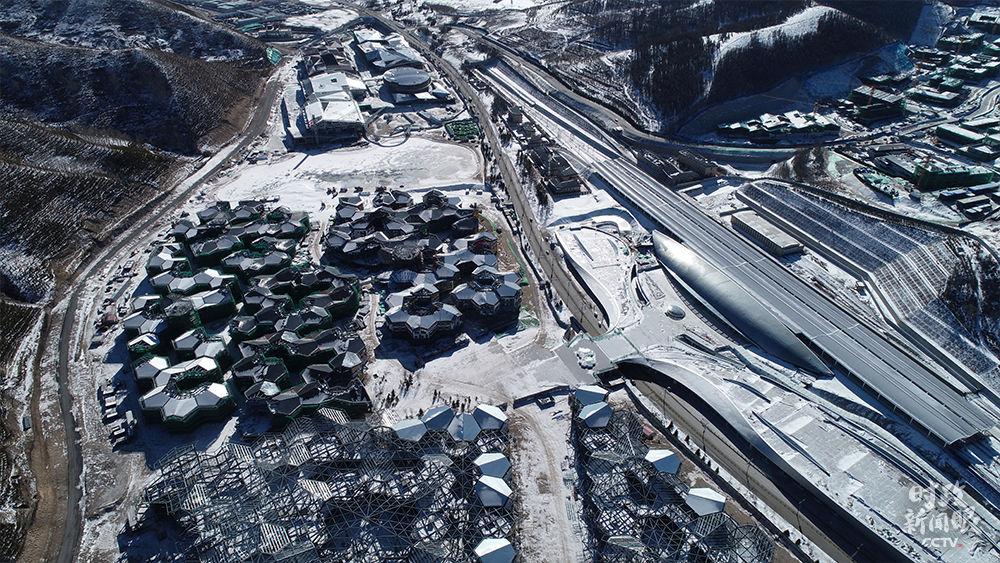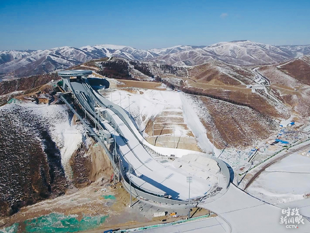 △国家跳台滑雪中心建设于山谷之间,主体建筑设计灵感源于中国传统饰物“如意”,取名“雪如意”。(总台央视记者李扬、刘翀拍摄)
