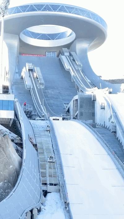 国家跳台滑雪中心已建成2条赛道,2020年11月通过国际雪联验收,化身为依山静卧的“雪如意”。