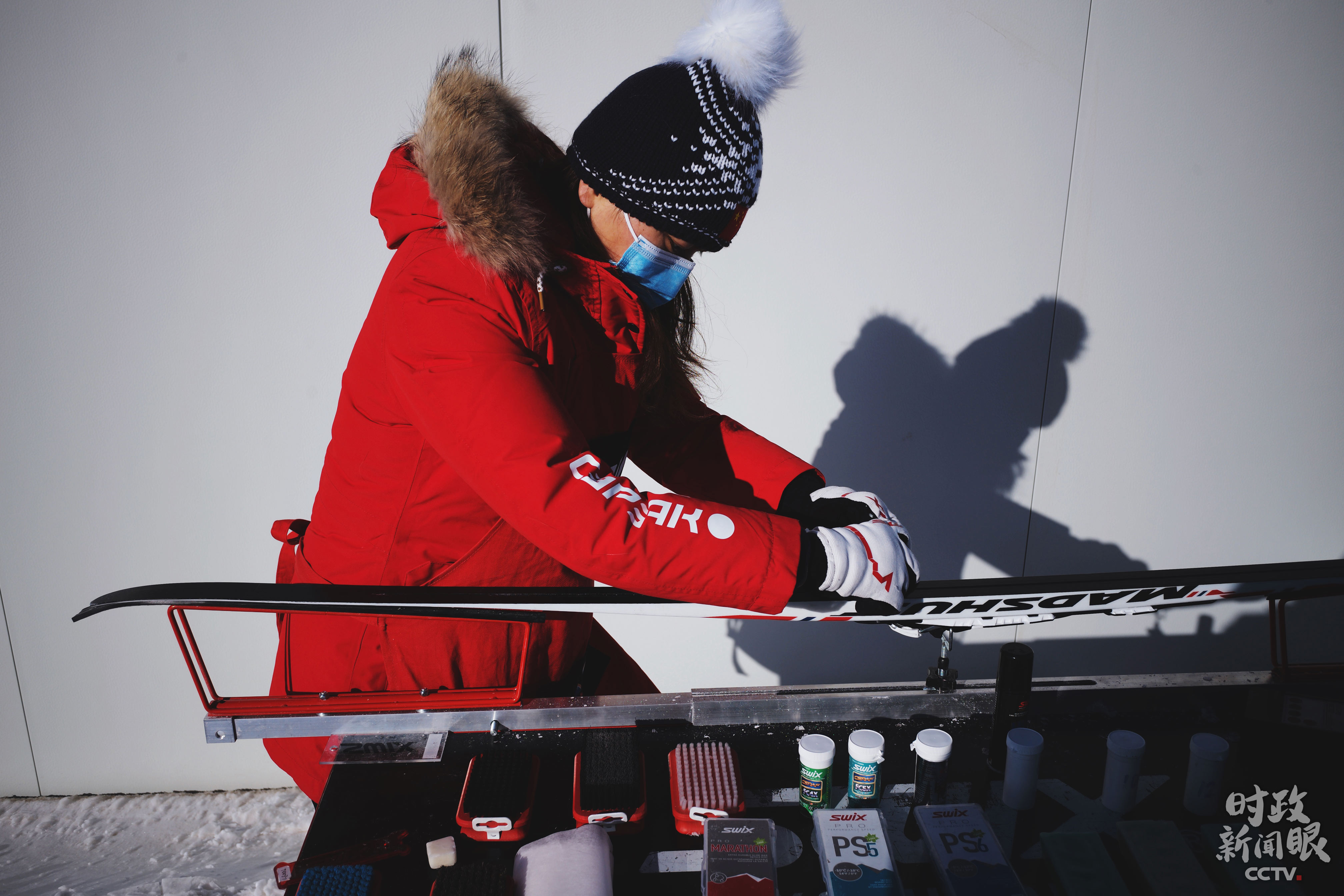 △国家冬季两项滑雪队柳圆圆在为雪板打蜡,打蜡后可以提升30%滑行速度。(总台央视记者王哈男拍摄)