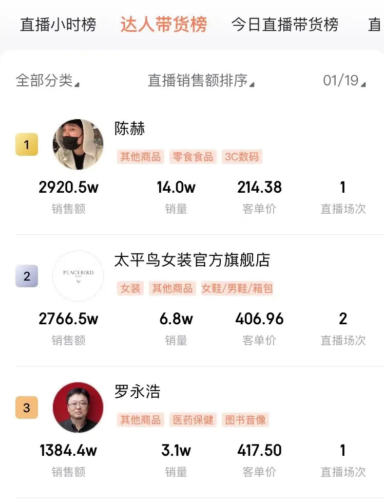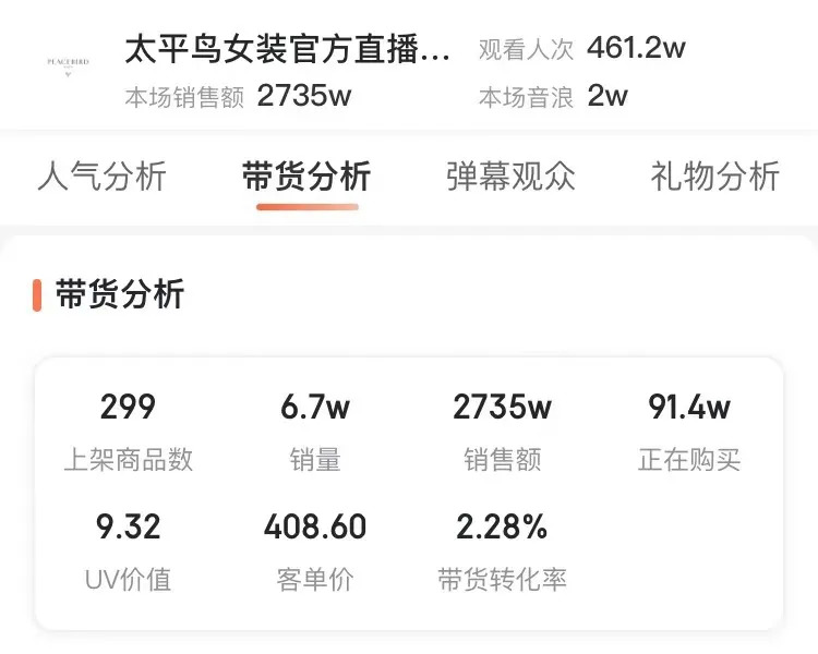 根据蝉妈妈数据显示,太平年女装1月19日的品牌自播专场,单场销售已经突破2000万,太平鸟女装直播间的带货能力与号召力,足以媲美明星名人主播。