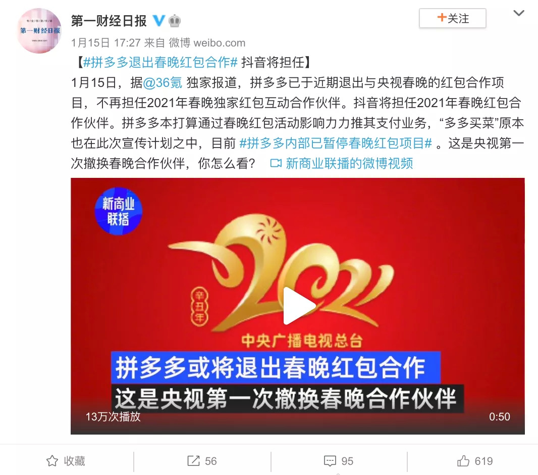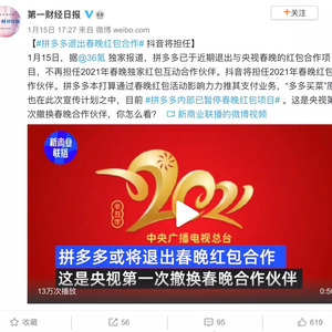 1月17日,多家媒体报道拼多多内部已暂停春晚红包项目,不再担任2021年春晚独家红包互动合作伙伴,而抖音则很有可能吃下这个大饼。