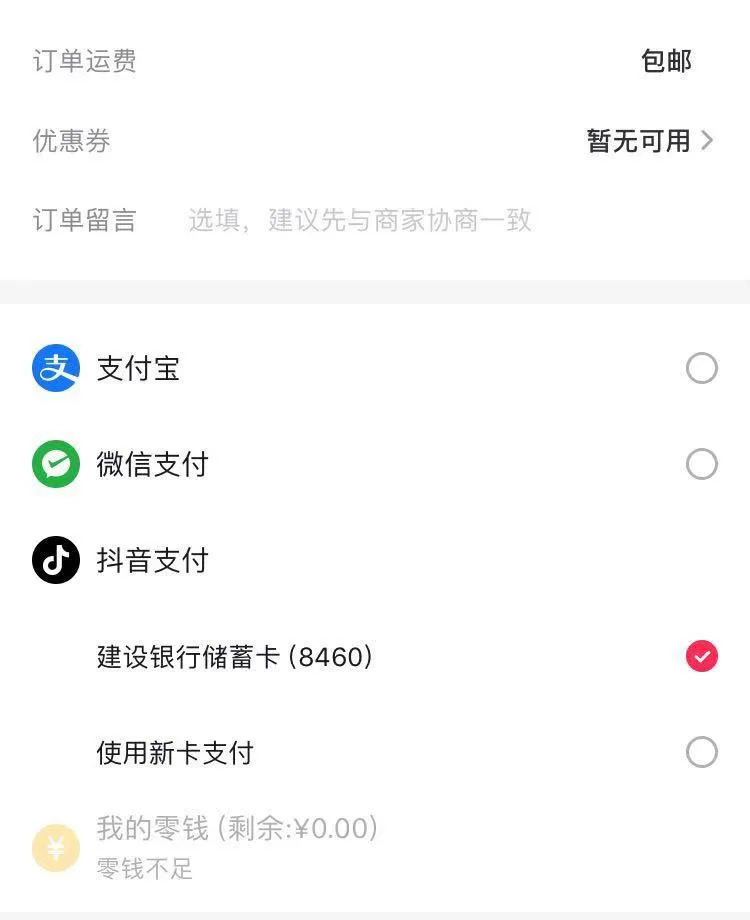 在抖音APP内,用户在支付订单时,除了支付宝和微信支付外,用户可以选择绑定银行卡,使用抖音支付来付款。