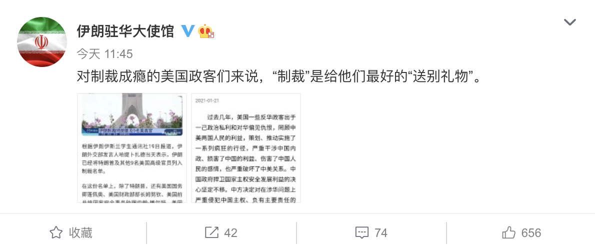 1月21日,@伊朗驻华大使馆 微博发文:对制裁成瘾的美国政客们来说,“制裁”是给他们最好的“送别礼物”。