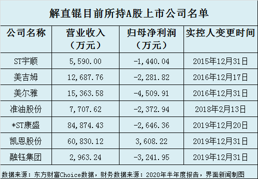 需要指出的是,在2015年控股ST宇顺后,解直锟分别在2016年12月连获美吉姆(002621.SZ)、美尔雅(600107.SH)两家上市公司,于2018年2月拿下准油股份(002207.SZ),以及于2019年12月控股*ST康盛(002418.SZ)、凯恩股份(002012.SZ)和融钰集团(002622.SZ)。如今这些公司的经营情况普遍堪忧。