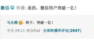 2012年3月29日凌晨4点,马化腾在腾讯微博上发了一个六字帖:“终于,突破1亿!”