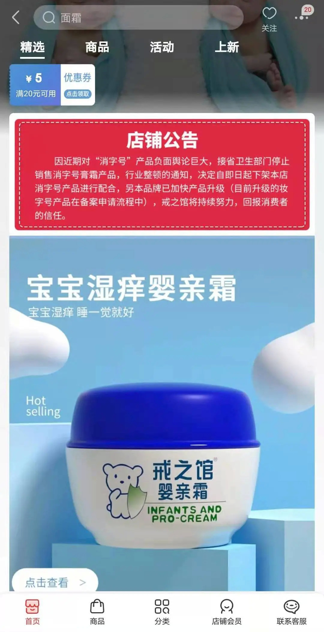 店铺首页公告表示,因消字号产品负面舆论巨大,接省卫生部门停止销售消字号产品通知故将产品下架,另品牌已加快升级(目前升级的妆字号产品在备案申请流程,功效如一)。