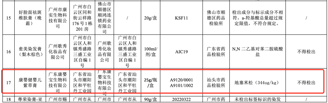 广东省药监局发布的《广东省化妆品监督抽检信息的通告(2020年第1期)》里,广东康婴宝生物科技有限公司(以下简称康婴宝)旗下的“康婴健婴儿紫草膏”被检测出禁止添加物地塞米松(344ug/kg)。