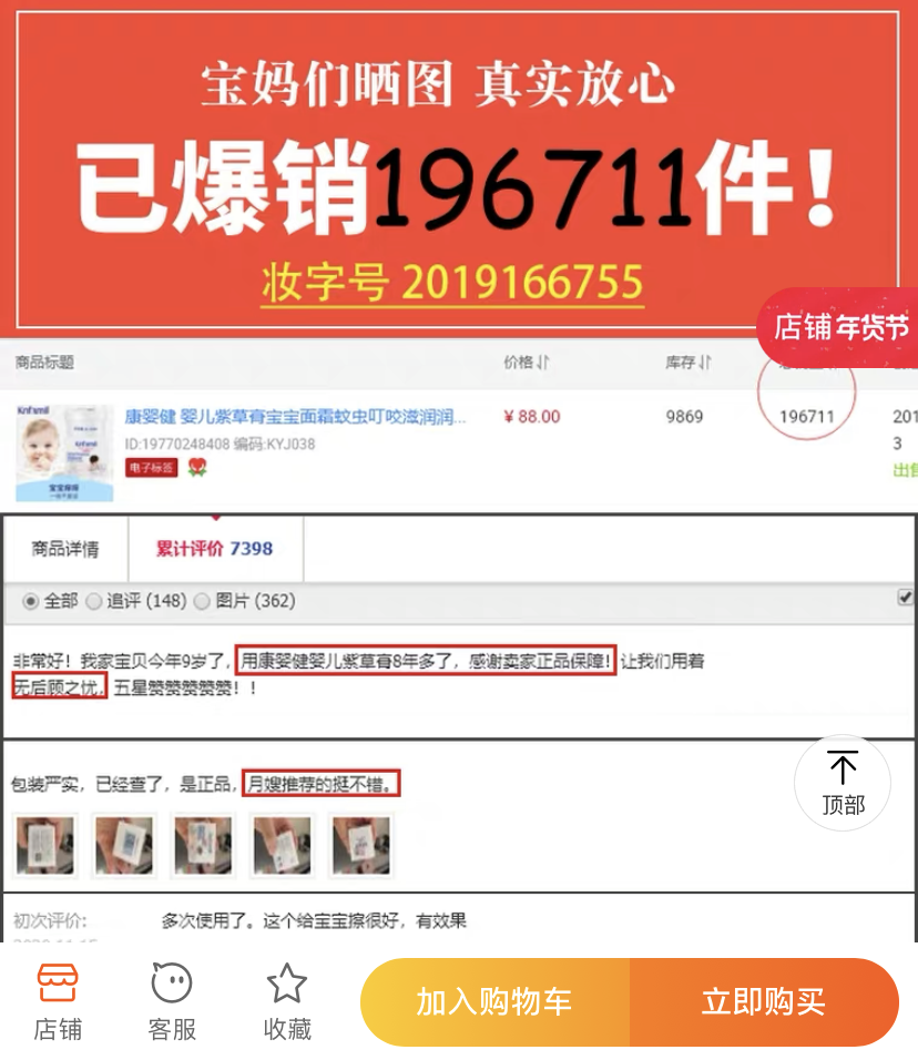 但在天猫康婴健旗舰店,无论是“康婴健婴儿紫草膏”还是“康婴健婴儿橄榄洗发沐浴露”现在仍在正常销售,且没有任何关于企业、产品曾遭受通告、处罚的提示。