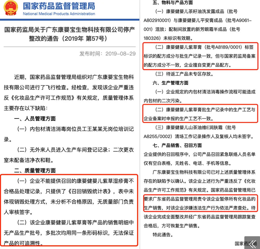 早在2019年8月29日,国家药监局《关于广东康婴宝生物科技有限公司停产整改的通告(2019年第57号)》就明确指出,康婴宝在人员管理、质量管理、物料与产品等方面存在问题,且某批次康婴健婴儿紫草膏标签标识的配方成分与批生产记录一致,但与国家药监局备案的配方成分不一致,企业擅自变更配方。