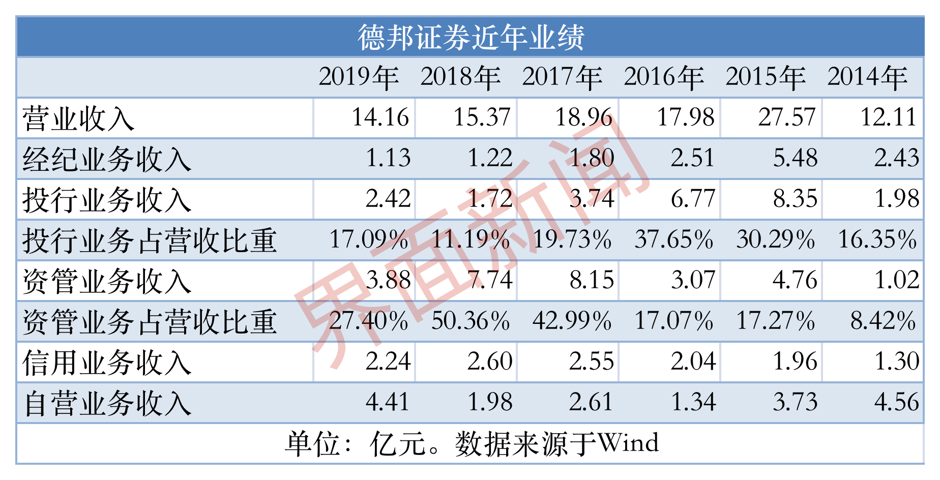 2015-2019年,德邦证券分别实现营收27.57亿、17.98亿、18.96亿、15.37亿和14.16亿,其中投行业务分别实现业务收入8.35亿元、6.77亿元、3.74亿元、1.72亿元和2.42亿元,投行业务收入占总营收的比重分别为30.29%、37.65%、19.73、11.19%和17.09%。