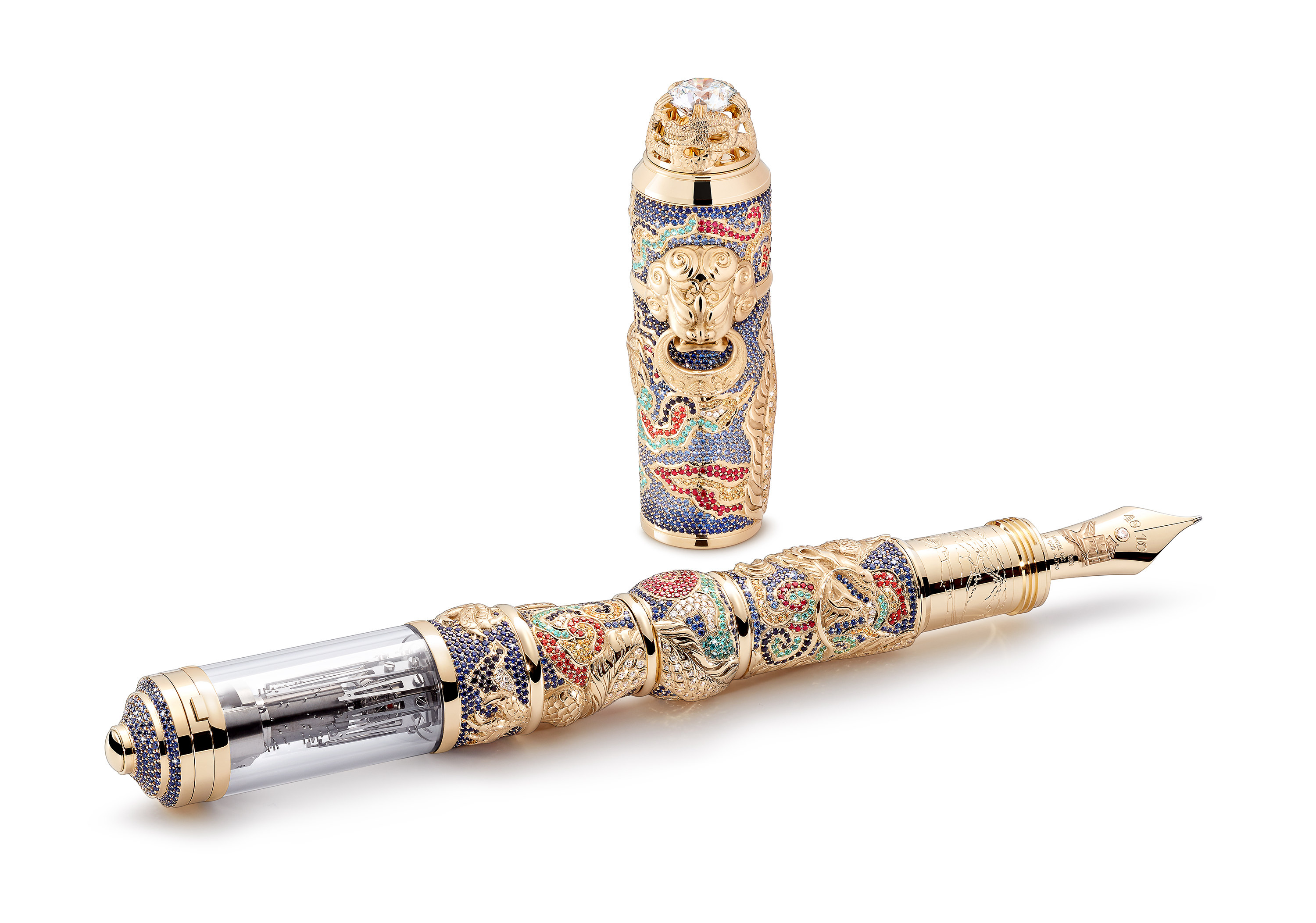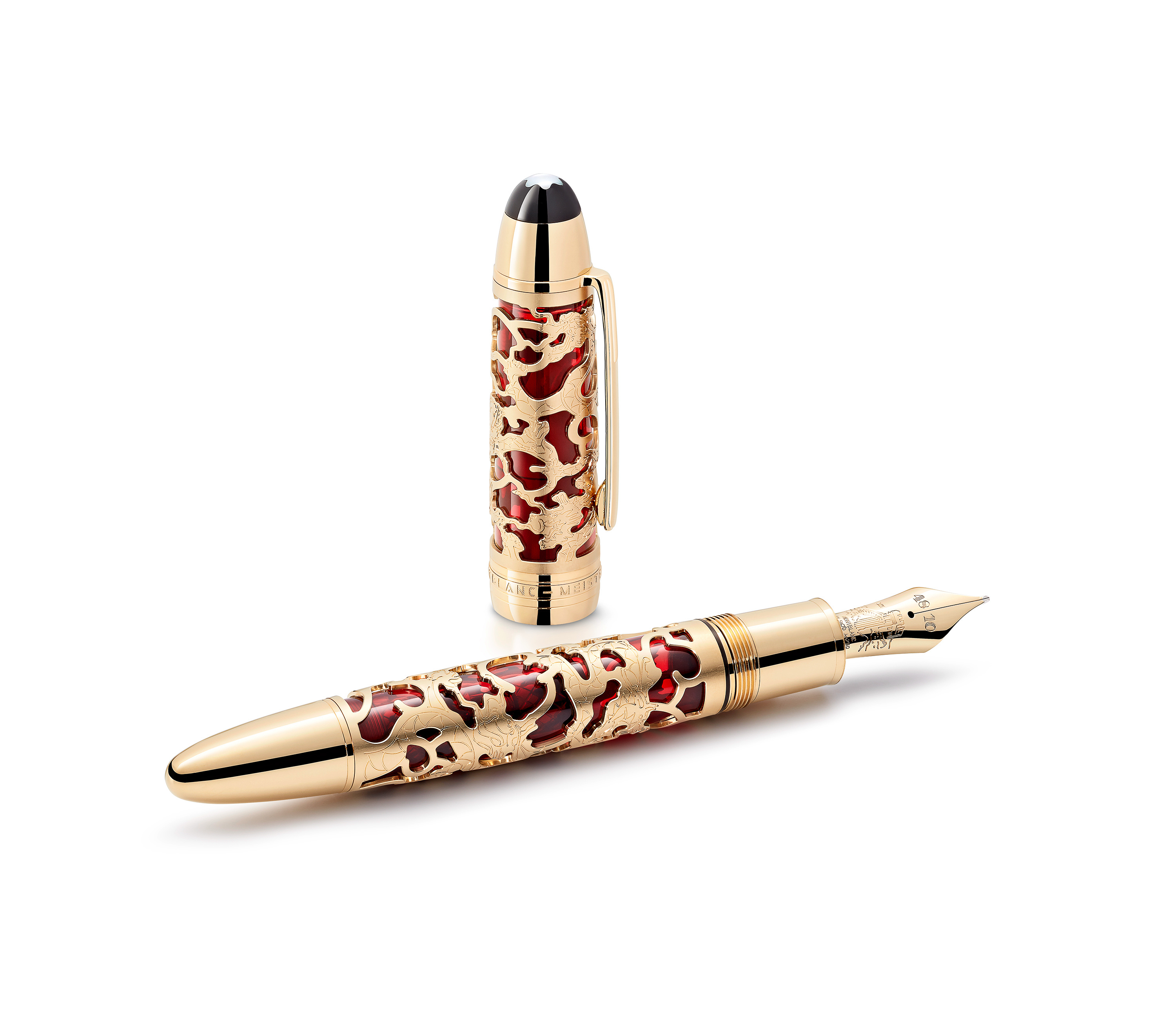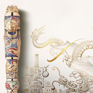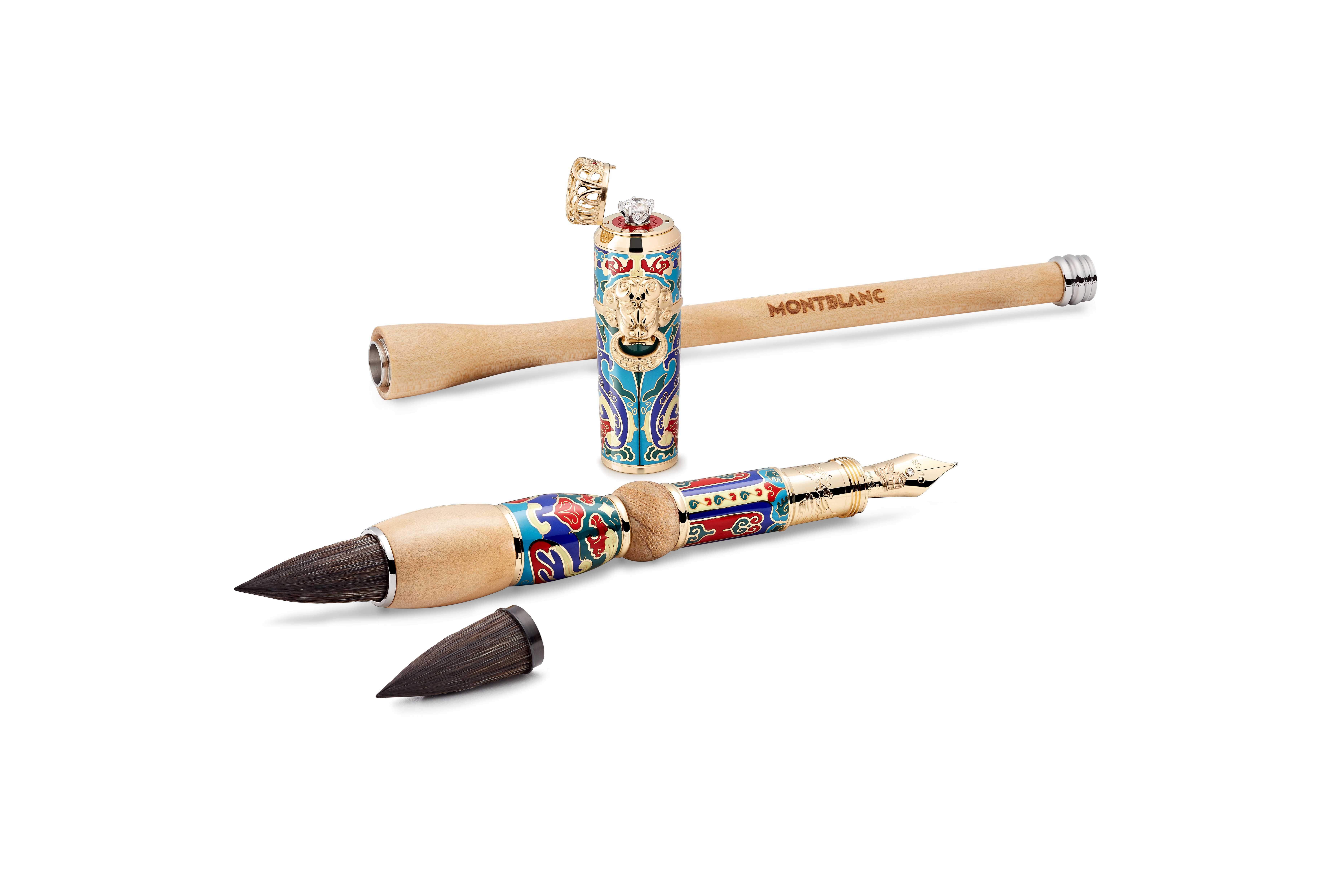 明·珐蓝瑞彩全球限量5支,采用掐丝珐琅和錾胎珐琅工艺打造笔帽与笔杆装饰,并以5种不同色调的釉料呈现出缠枝莲花与龙纹图案。镂空笔帽顶端是一颗1.8克拉明亮式切割钻石,18K金笔夹上以3D手工镌刻狮子图案,并以卡拉哈里玉石打造旋转笔环。这也是万宝龙首次以毛笔为整体灵感,松鼠毛笔尾以半透明漆层固定。