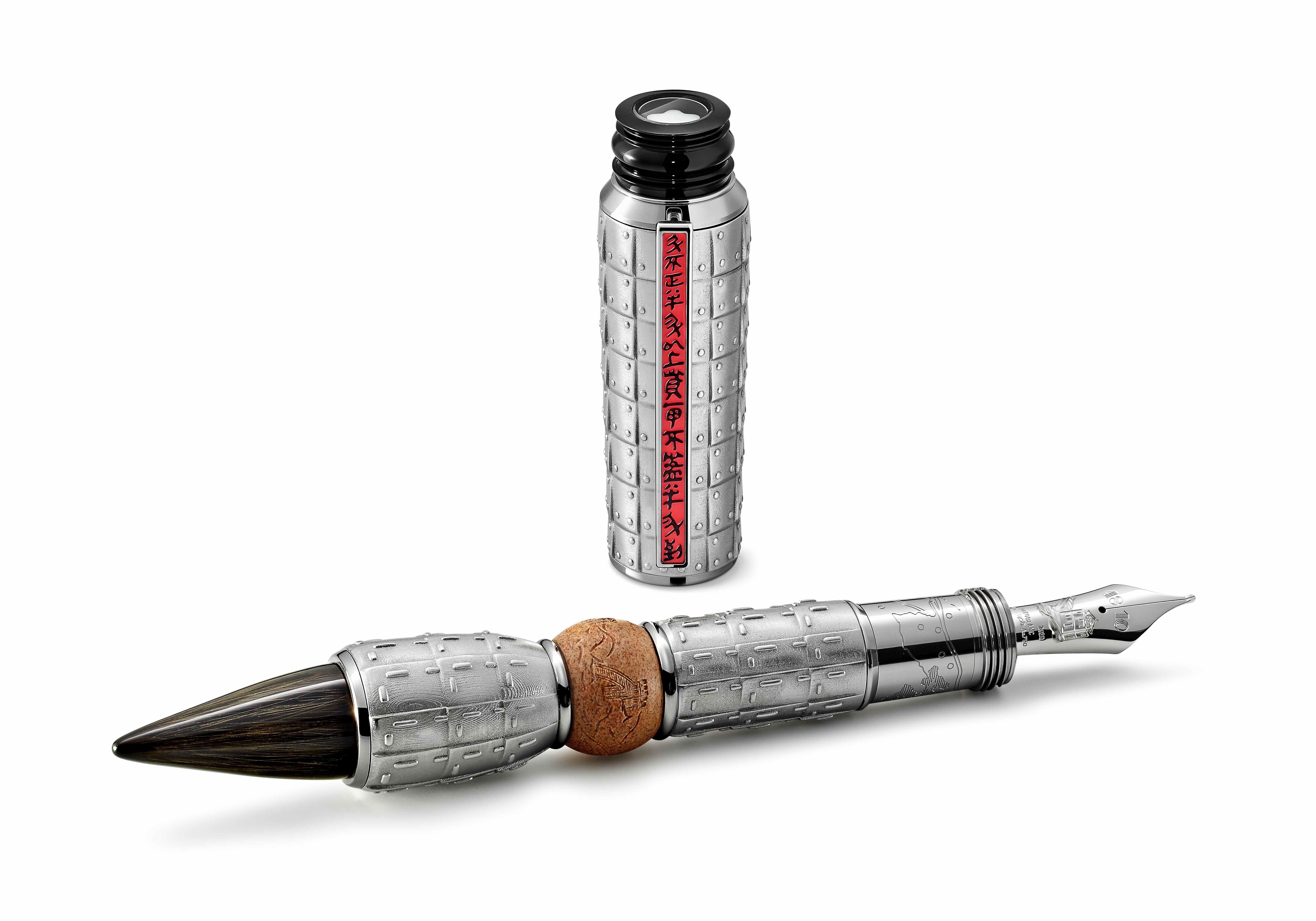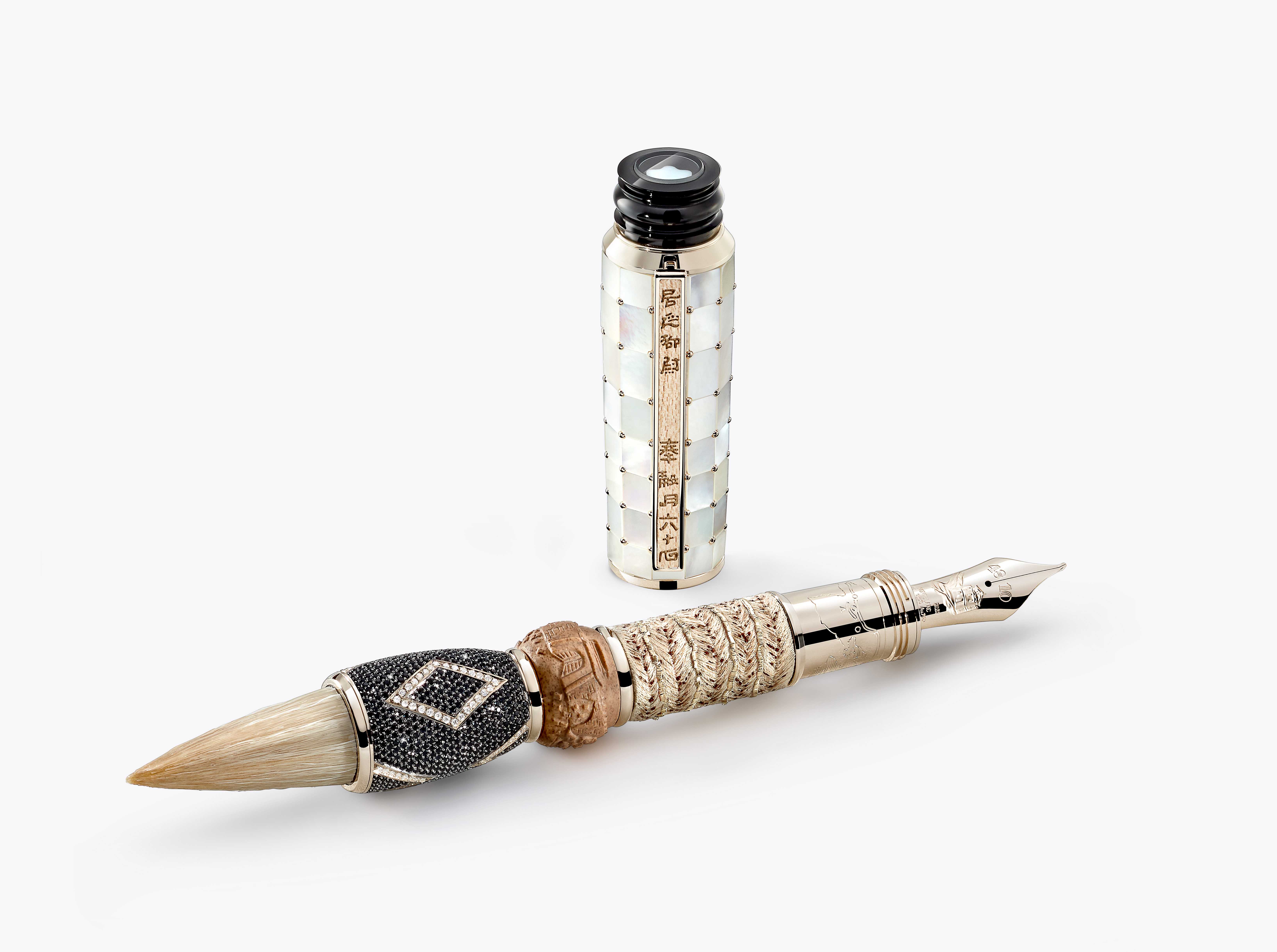 汉·流金丝路全球限量10支,笔杆装饰图案用金线手工刺绣于真丝材质之上,笔帽镶拼由金针固定的珍珠母贝饰片,笔尾以山羊毛和人造毛打造,笔夹所饰木质嵌片上以激光刻印文字。秦·经文纬武全球限量88支,笔帽与笔杆由18K白金打造,笔毫以铜胎作底并冠以砚台造型的精致笔帽,红漆笔夹上镌刻秦律《睡虎地秦墓竹简》。